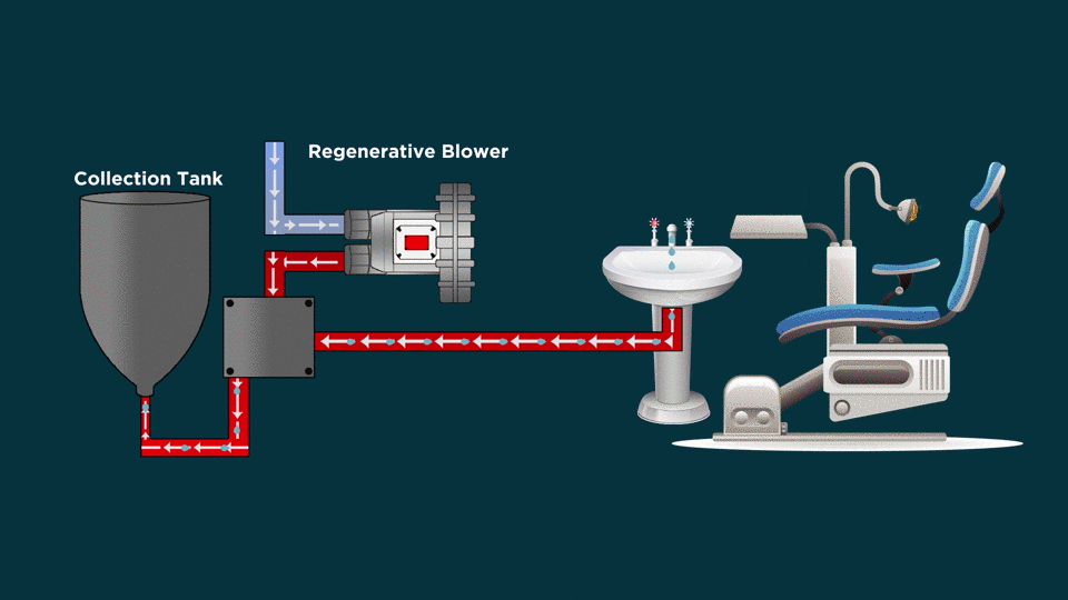 A Regenerative Blower can be used to collect waste fluid from a dental chair to a collection tank.