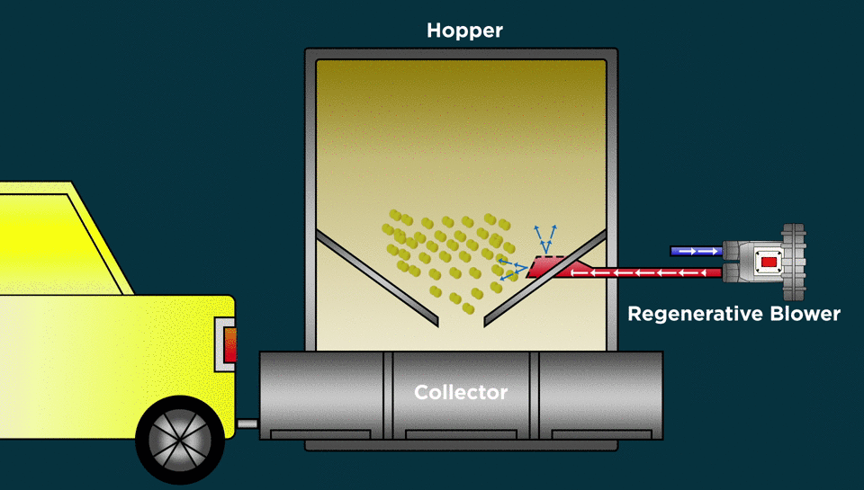 Hoppers can sometimes become clogged by bringing material from a larger area down to a smaller area. A Regenerative Blower or Centrifugal Blower can be used to agitate the material inside to encourage movement to the smaller area of the hopper.